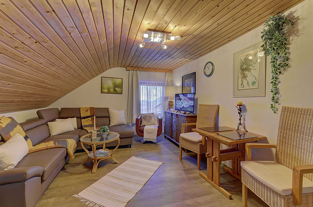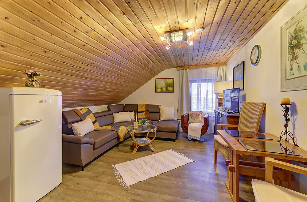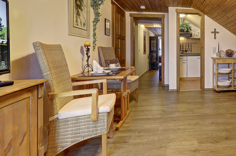 Unsere Ferienwohnung Budget ohne Balkon glänzt auch ohne spektakuläre Aussicht. Die trotz Mansarde räumlich geschickt gestaltete Ferienwohnung steht in ihrer Ausstattung unserem Standard in nichts nach. Stilvolle bayerische Altholzmöbel, eine eigene Küche, die gemütliche Couch im Wohnzimmer und ein bequemes großes Bett im Schlafzimmer laden zum Verweilen ein. Genießen sie die Wohlfühlatmosphäre.